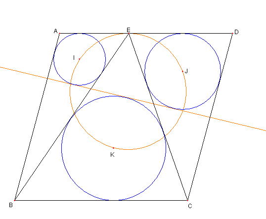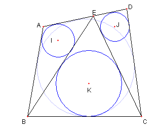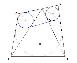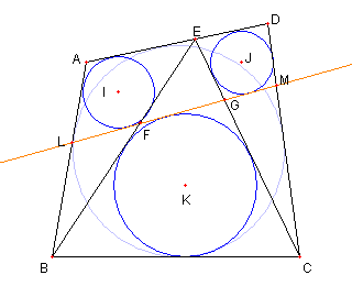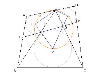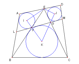 今までの記号を変えて説明します A, B, C, D, E, I, J, K は 今までと同じとし 円 I, J, K の共通接線と 直線 EB, EC, AB, DC との交点を 各々 F, G, L, M とする |