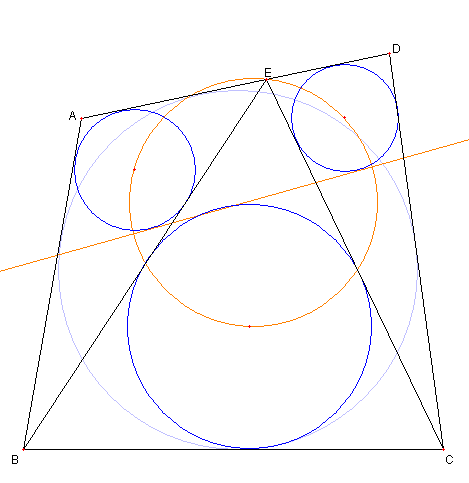円に外接する四辺形と内心と外接円 図において 四辺形 ABCD は円に外接する四辺形で E は辺 AD 上の点とする I, J, K は各々 僊BE, 僞CD, 僞BC の内心とする このとき @ 三つの内接円に接する直線がある A 四辺形 EIKJ は円に内接している 問題の説明 @の証明 Aの証明 Top に戻る |