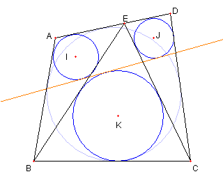@ 三つの内接円 I, J, K に接する直線がある。 A 四辺形 EIKJ は円に内接している @の証明 Aの証明 Top に戻る |